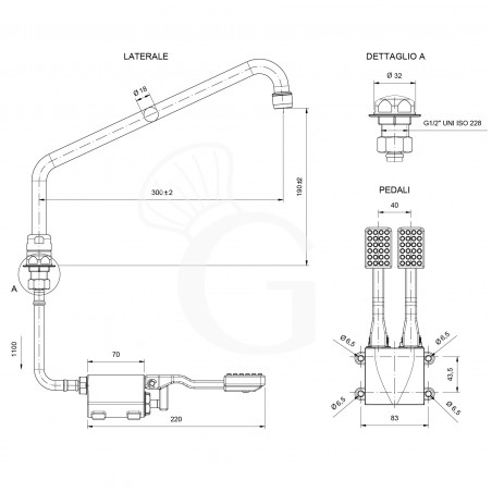 Rubinetto miscelatore a pedale con doppia leva di comando e basetta esagonale.