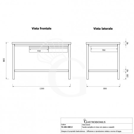 Tavolo semplice in acciaio inox con piano, 2 cassetti e lunghezza 1300 mm x profondità 800 mm x altezza 865 mm.
