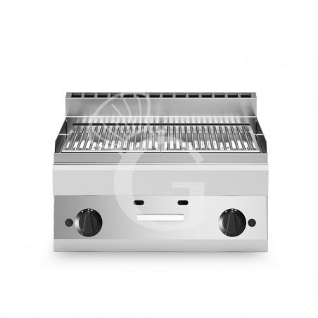 Griglia a gas e pietra lavica da banco con 2 zone di cottura in acciaio e profondità 650 mm.
