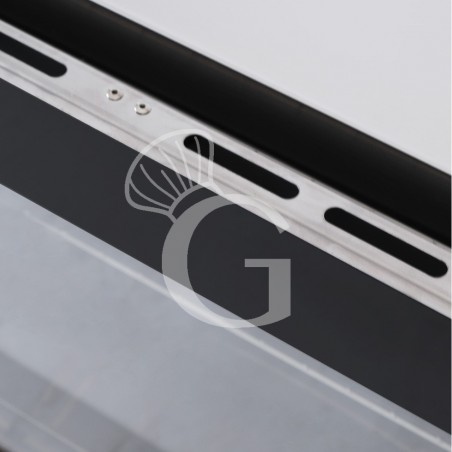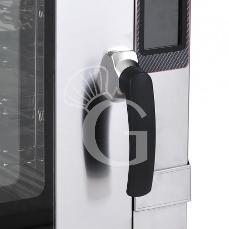 L'apertura della porta è a bandiera, la maniglia resistente ed ergonomica. Per assicurare una facile gestione e la pulizia le cremagliere sono estraibili, la camera di cottura è diamantata in acciaio inox AISI 304 con bordi arrotondati per facilitare lo scarico della condensa interna. Le cremagliere reggi griglia sono progettate con fissaggio verticale per evitare che le alte temperature deformino il materiale e creino uno scorretto integliamento. La porta, inoltre presenta doppio vetro con vetro interno basso emissivo e removibile per facilitarne l'igiene.