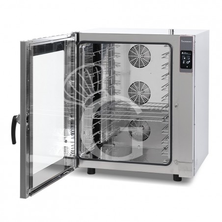 La struttura in acciaio inox del forno si adatta all’inserimento di 10 teglie di dimensioni 600 mm x 400 mm oppure GN 1/1 (la cremagliera permette di inserire sia teglie/griglie 60x40 che GN1/1, quest’ultima con antiribaltamento). Il maggiore interasse tra le teglie permette una migliore circolazione dell'aria calda. La camera di cottura è stampata in acciaio inox AISI 304 con bordi arrotondati.