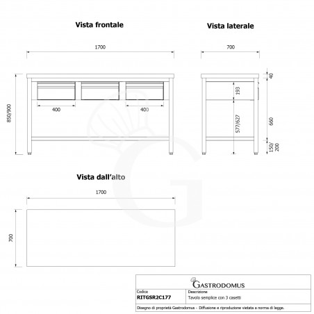 Tavolo inox 3 cassetti L 1700 mm x P 700 mm x H 850 mm