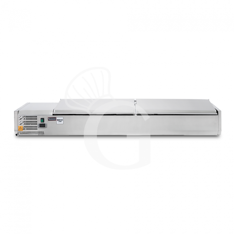 Vetrinetta refrigerata per pizzeria motore a sinistra con coperchio in acciaio inox L 1800 mm per 8 bacinelle GN1/3.