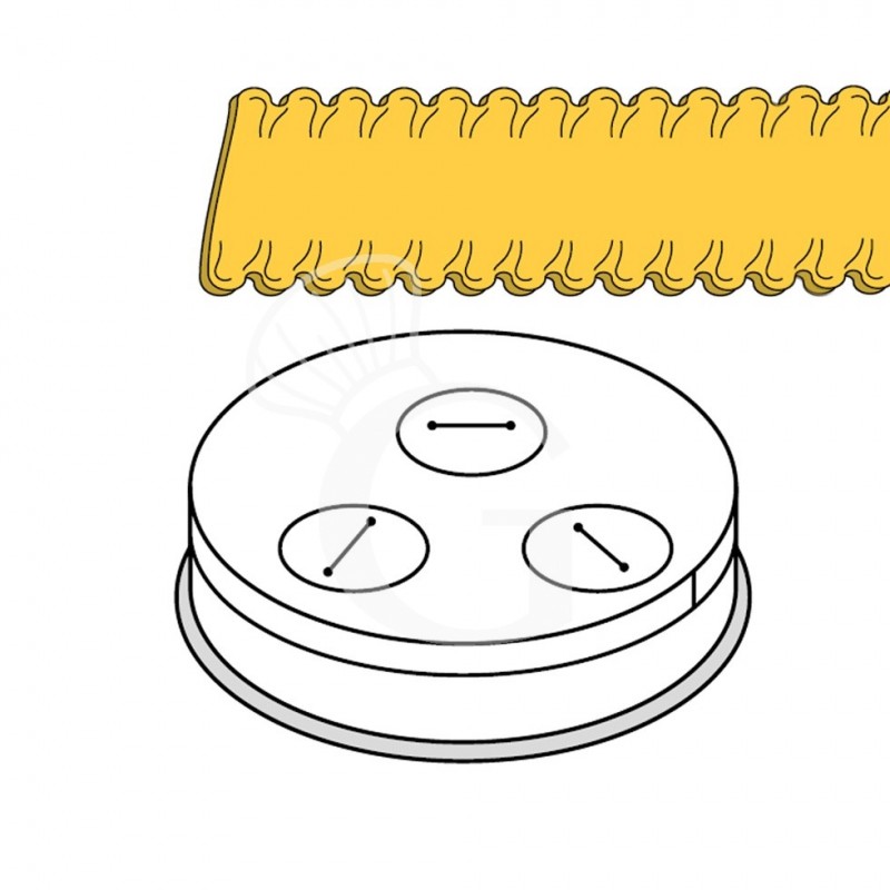 Realizzata in bronzo-ottone di alta qualità, questa trafila garantisce una trafilatura tradizionale che dona alle pappardelle la giusta porosità, perfetta per trattenere i condimenti. Compatibile con macchine per pasta fresca MPF/8N e dotata di fori da 16 mm per un formato autentico e uniforme.