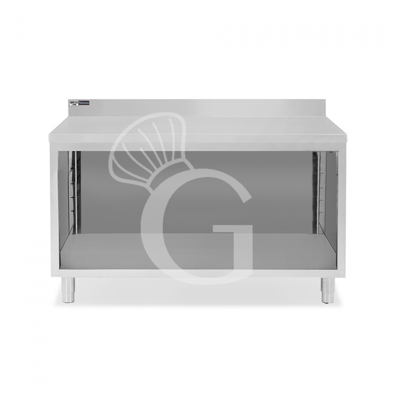 Tavolo a giorno in acciaio inox, alzatina e lunghezza 1700 mm x profondità 700 mm x altezza 965 mm.