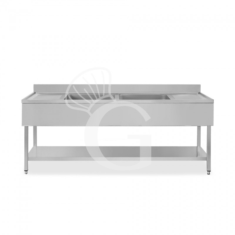 Lavello semplice in acciaio inox con alzatina, 1 ripiano, 2 vasche e 2 gocciolatoi, lunghezza 2000 mm x profondità 600 mm x altezza 950 mm.