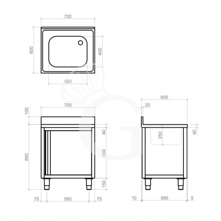 Lavello armadiato con 1 porta battente, 1 vasca, alzatina e lunghezza 700 mm x profondità 600 mm x altezza 950 mm.